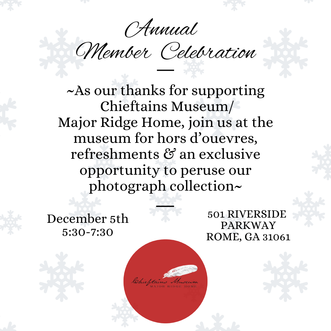 As our thanks for supporting Chieftains Museum/ Major Ridge Home, join us at the museum for hors d’ouevres, refreshments & an exclusive opportunity to peruse our photograph collection. Become a member by December 5th to partake in the member festivities!